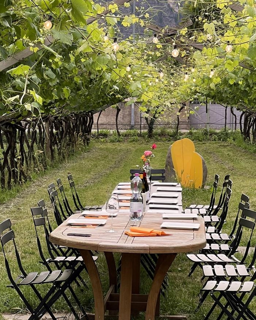 Umgeben von viel Grün bieten wir in den heißesten Monaten des Jahres ein exklusives Abendessen im Weinberg an, um einen Abend in einer einzigartigen Atmosphäre zwischen den Reihen von Teroldego zu verbringen.