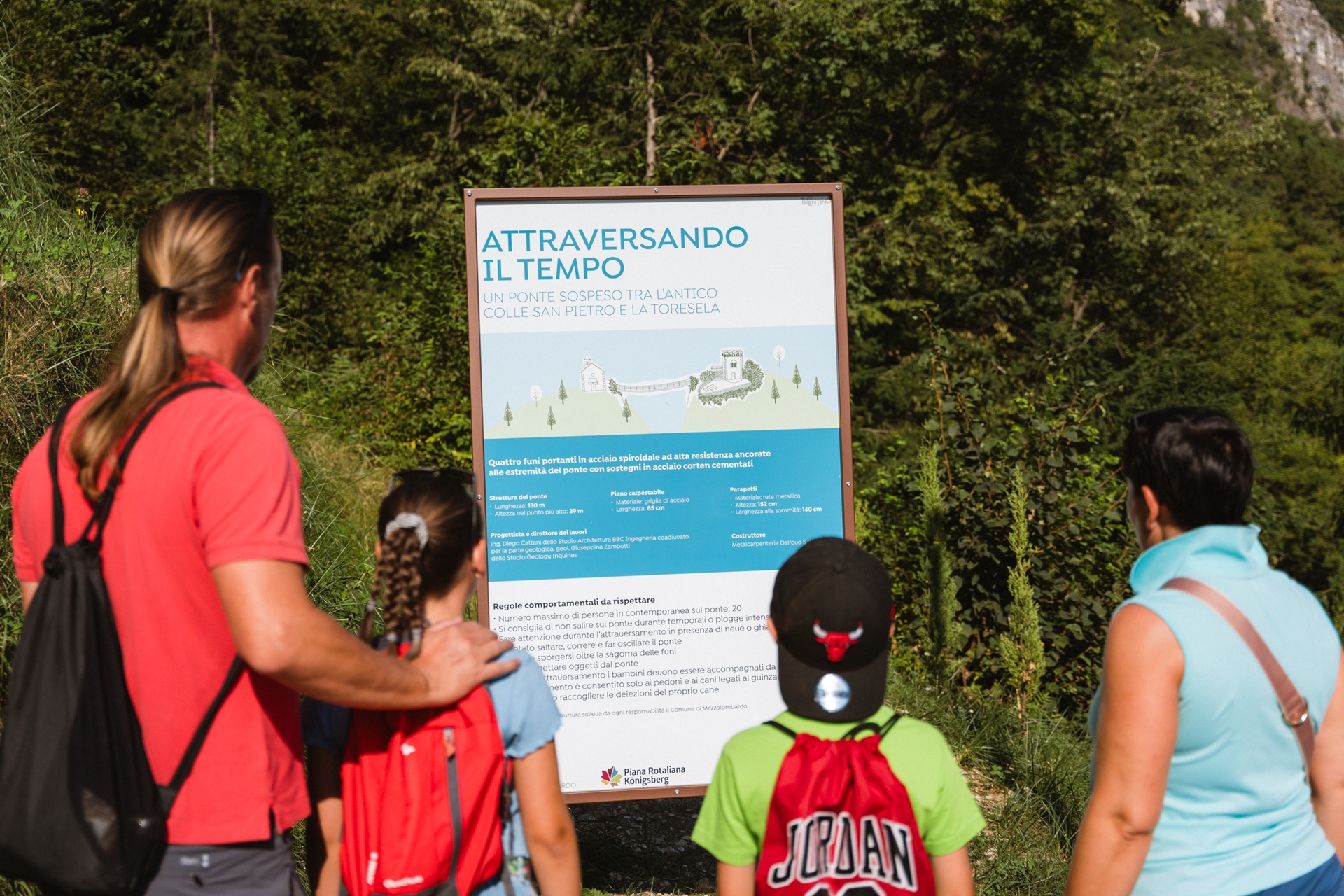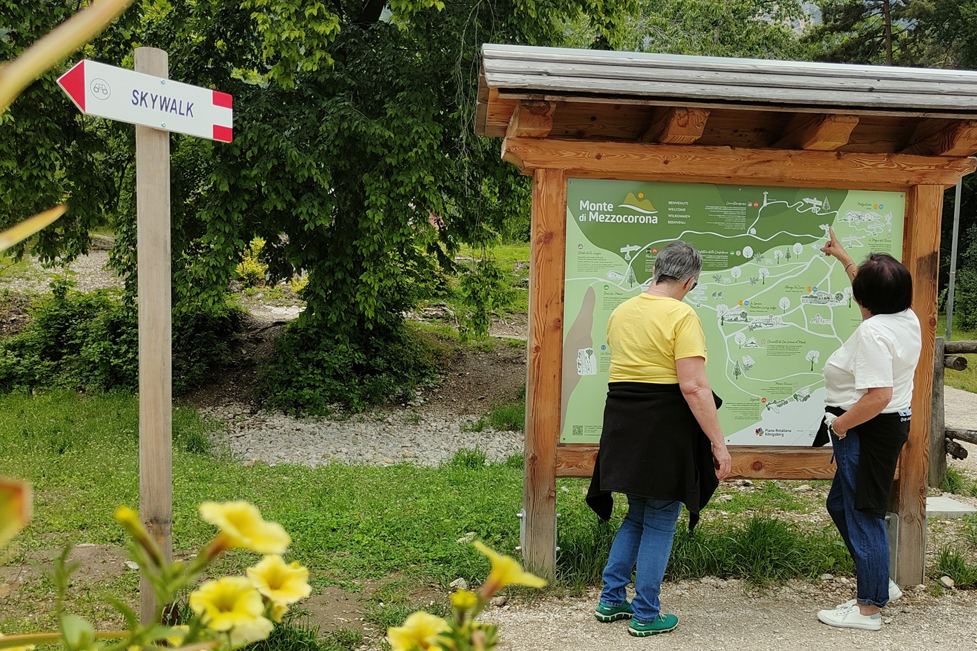 In recent years, local administrations have invested with commitment and vision in the creation of new infrastructures and attractions, designed to enhance our territory and make it increasingly welcoming, dynamic, and attractive for both residents and visitors. Among these works, the panoramic Skywalk on Monte di Mezzocorona, the evocative suspension bridges, the scenic walkway over the Avisio River, the Val del Rì via ferrata, the nature trail along the Noce River, and the Giro del Vino 50 itinerary. However, for these opportunities to be fully appreciated and to truly become moments of connection, discovery, and well-being, it is essential to ensure full accessibility along with clear and effective communication. Precisely for this reason, in parallel with the creation of the new attractions, work was done on a coordinated, clearly visible and coherent signage system, capable of orienting with simplicity and describing the territory in an engaging way that respects its identity. We believe that enhancing a territory also means making it readable, inclusive and usable so that everyone can experience it with ease, safety, and awareness, discovering its natural, cultural, and food and wine richness. Step by step, with these initiatives, we are building a more open, inclusive community, committed to collective well-being and proud of its roots.